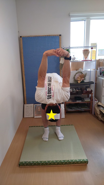 お辞儀をしながら背中の後ろで組んだ腕を上げていく時に、息をフ~っと大きく吐きましょう。これ以上曲がらない所まで行ったら、息を吸いながらゆっくり体を起こしてきます。