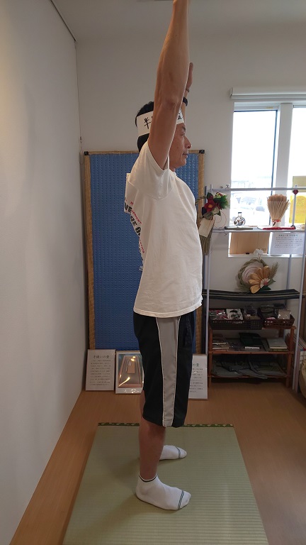 両手をしっかり上に伸ばしましょう。元気ポーズとバンザイポーズを交互に数回繰り返してください。