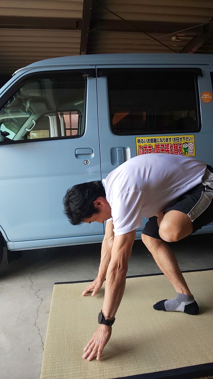 片足立ちのまま前かがみになり、両手の平を畳にしっかりと着けます。