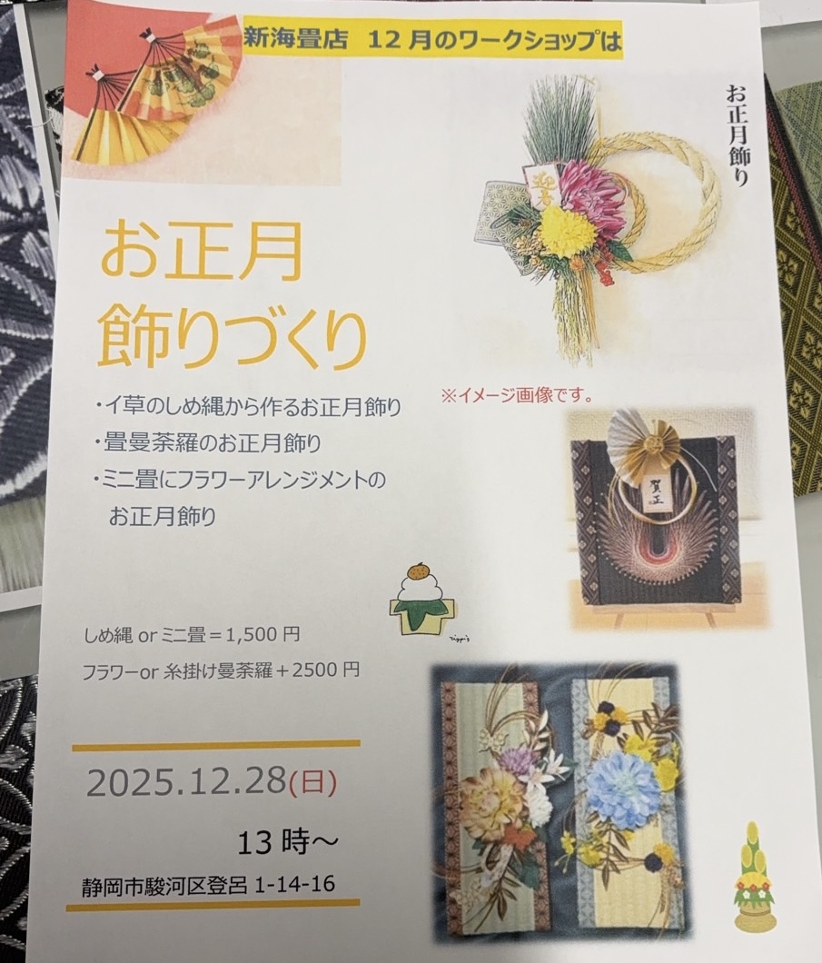 2025.12.20 12月の月一ワークショップはお正月飾り作りです。三種類のお飾りから選択できます。 日時は12月28日(日)13時~、場所は新海畳店のショールーム(静岡市駿河区登呂-14-16)です。 参加費はしめ縄またはミニ畳作りのみで1500円、後半のフラワーアレンジメントまたは糸掛け曼荼羅が+2500円です。 ご予約はこちらのホームページのお問い合わせ欄からお願いします。